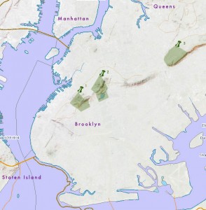 The Brooklyn terminal moraine with secondary elevations : 2. Bay Ridge- Dyker Heights 2. Sunset Heights 3. Owl's Head 4. Fort Greene Park 5. Brooklyn Heights